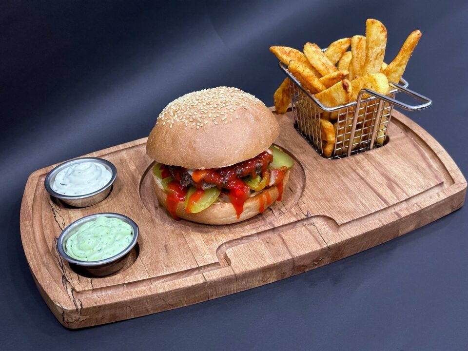 Burger Köftesi, ızgara biber, jalapeno biberi, double mozzarella peyniri, kornişon turşu, acı sos, ranch sos. Patates kızartması ile
